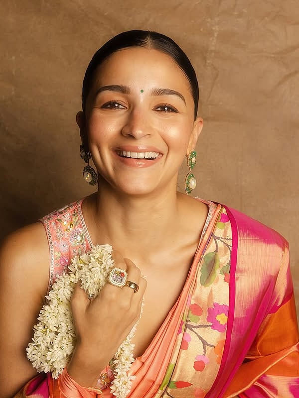 ഫ്ലോറൽ ബോർഡർ പ്രിൻ്റോടു കൂടിയ പൈത്താണി സാരിയാണ് ആലിയ അണിഞ്ഞിരിക്കുന്നത്. പൂർണമായും കൈത്തറിയിലാണ് ഇത് നെയ്തെടുത്തിരിക്കുന്നത്.