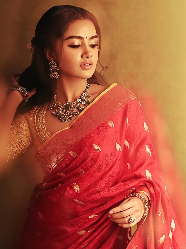 കല്ലുകളും മുത്തുകളും പതിപ്പിച്ച മാലയും കമ്മലുമാണ് ലുക്കിനായി അനുപമ തിരഞ്ഞെടുത്തിരിക്കുന്നത്.