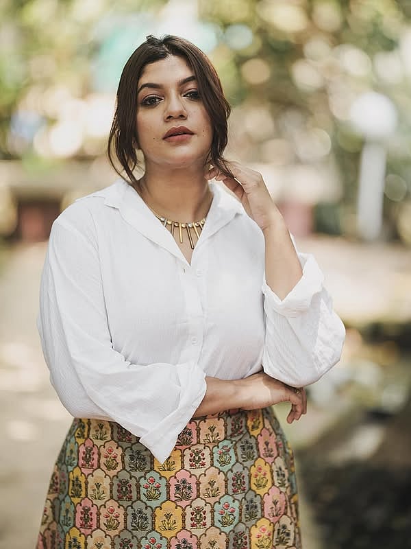 വെള്ള നിറത്തിലെ ടോപ്പിലും എംബ്രോയ്ഡറി വർക്കുകൾ കൊണ്ട് സമ്പന്നമായ സ്കേർട്ടുമാണ് അപർണയുടെ വേഷം.