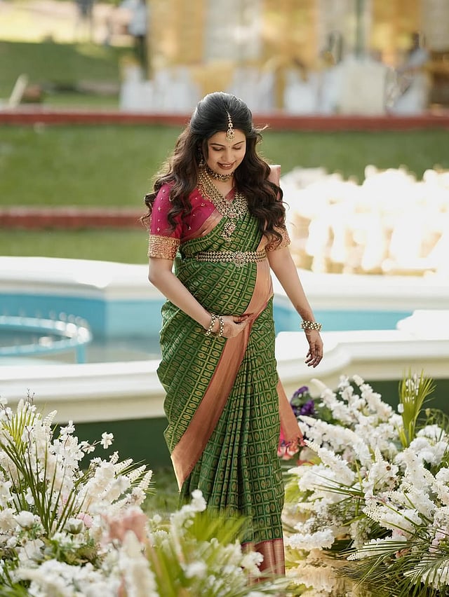പീകോക്ക് ഗ്രീനിലുള്ള പട്ടുപാവാടയും പിങ്ക് ബ്ലൗസും ദാവണിയും അണിഞ്ഞാണ് ഹന്സിക എത്തിയത്.