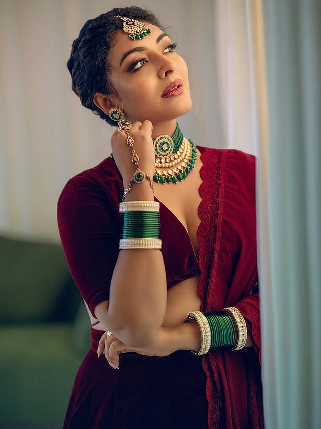 വൈന് റെഡില് വരുന്ന വെല്വറ്റ് ലെഹങ്കയാണ് താരം അണിഞ്ഞിരിക്കുന്നത്. ഡീപ് വി നെക്കില് വരുന്ന ടോപ്പാണ് ശ്രദ്ധാകേന്ദ്രം.
