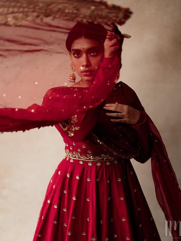 ചുവപ്പ് നിറത്തിലെ സൽവാറിലാണ് ദുഷാര തിളങ്ങിയിരിക്കുന്നത്.