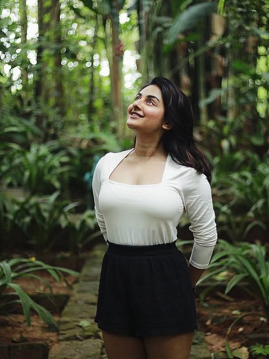വെള്ള ഫുൾകൈ ടീഷർട്ടും ഷോർട്ട് സ്കർട്ടും ധരിച്ചു നിൽക്കുന്ന എസ്തറിനെയാണ് ചിത്രങ്ങളിൽ കാണുന്നത്.
