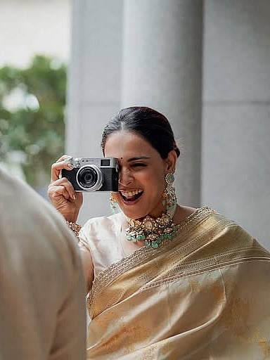 ഐവറി നിറത്തിലെ കാഞ്ചീവരം സാരിയിലാണ് ജെനീലിയയെ കാണാൻ കഴിയുക. സർദോസി ബോർഡറാണ് സാരിയുടെ ഹൈലൈറ്റ്.
