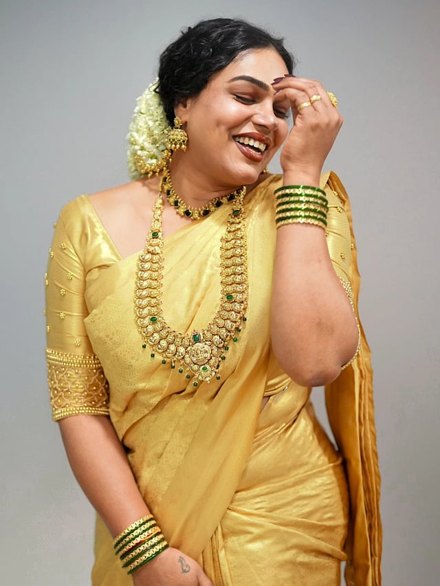 ഗോള്ഡന് കളര് സാരിയില് കല്യാണപ്പെണ്ണിനെപ്പോലെയാണ് ഒരുങ്ങിയിരിക്കുന്നത്.