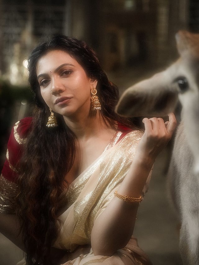 സ്വര്ണ കരയോടെയുള്ള ക്രീം സാരിയാണ് താരം ധരിച്ചിരിക്കുന്നത്. ഗോള്ഡന് വര്ക്കിലുള്ള ചുവന്ന ബ്ലൗസിനൊപ്പമാണ് ലുക്ക്.