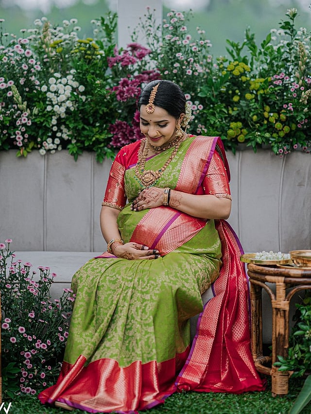 നാടന് ലുക്കില് പച്ച കാഞ്ചീപുര പട്ടുസാരിയും ചുവപ്പ് ബോര്ഡറുള്ള സാരിയുമാണ് വേഷം.