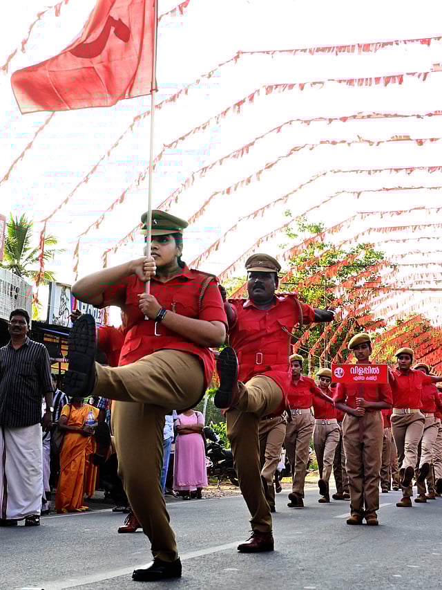 സിപിഎം തിരുവനന്തപുരം ജില്ലാ സമ്മേളനത്തിന് സമാപനം കുറിച്ചു നടന്ന റെഡ് വോളണ്ടിയര് മാര്ച്ചിനു നേതൃത്വം നല്കാനെത്തിയത് മേയര് ആര്യാ രാജേന്ദ്രന്