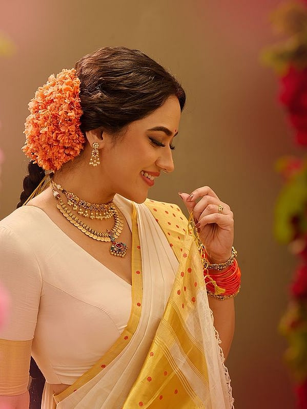 സെറ്റ് സാരിയിൽ വിവിധ ലുക്കിലുള്ള ചിത്രങ്ങളാണ് മിയ പങ്കുവച്ചിരിക്കുന്നത്.