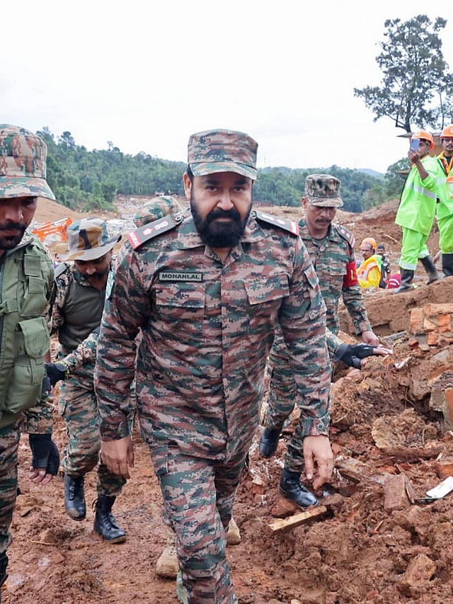 സൈനിക വേഷത്തിലാണ് മോഹൻലാൽ ഉരുൾപൊട്ടൽ തകർത്തെറിഞ്ഞ മേപ്പാടിയിൽ എത്തിയത്.