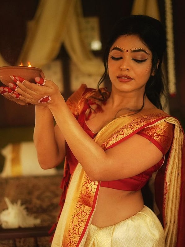 കടും ചുവപ്പ് നിറത്തിലെ വസ്ത്രങ്ങളിലാണ് മാളവിക മേനോന്റെ നവരാത്രി ലുക്ക്.