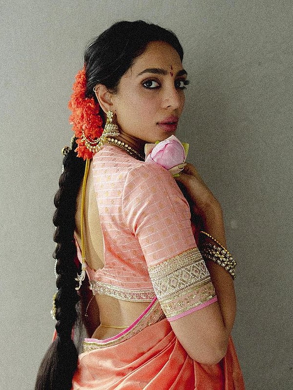 ശോഭിതയുടെ പിന്നിയിട്ട മുടിയിൽ കനകാംബര പൂക്കൾ കൊണ്ട് അലങ്കരിച്ചിരുന്നു. സിംപിളായുള്ള വളകളും മാലയും കമ്മലുമാണ് ശോഭിത ധരിച്ചത്.