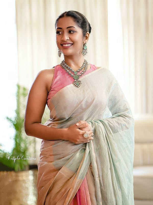 പേസ്റ്റൽ ഗ്രീൻ വിത്ത് പിങ്ക് ഷെയ്ഡിലുള്ള സാരിയാണ് നവ്യ ധരിച്ചിരിക്കുന്നത്.