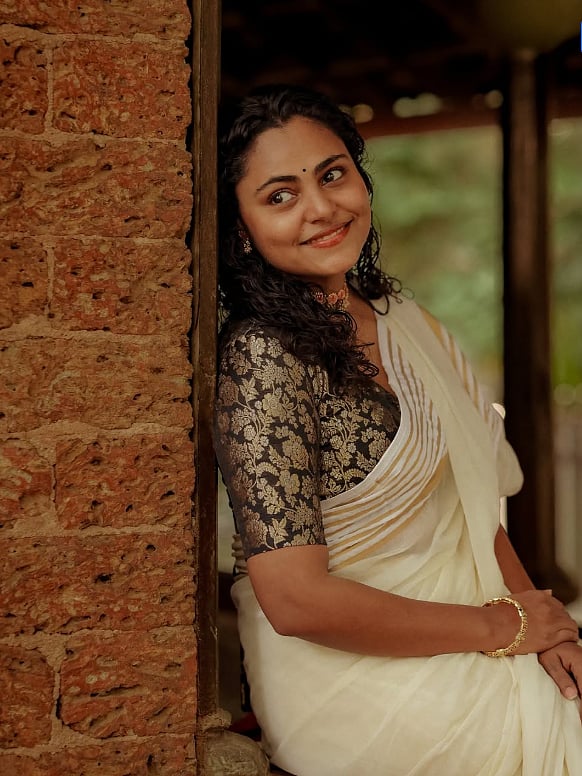 ഗോൾഡൻ കളർ കസവ് സെറ്റ് സാരിയാണ് താരത്തിന്റെ ഔട്ട്ഫിറ്റ്