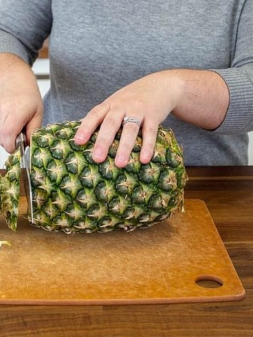 പൈനാപ്പിളിന്റെ മുകൾ ഭാഗവും താഴ്ഭാഗവും മുറിച്ചു മാറ്റുക.