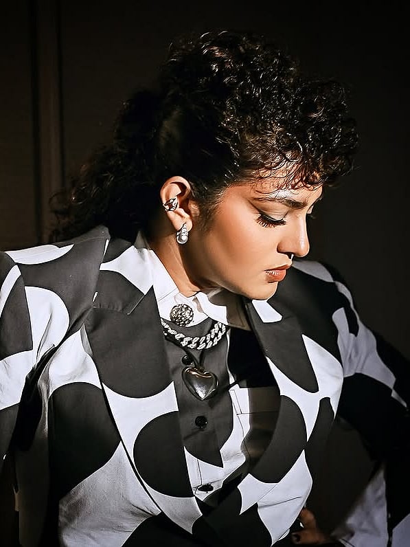 കറുപ്പും വെളുപ്പും ഇടകലർന്ന വസ്ത്രത്തിലാണ് പാർവതിയെ ചിത്രങ്ങളിൽ കാണാനാവുക.
