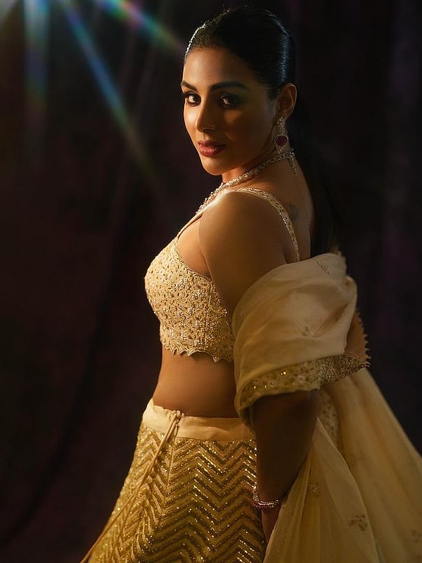 ക്രീം നിറത്തിലെ ലെഹങ്കയിൽ അതീവസുന്ദരിയാണ് താരം.