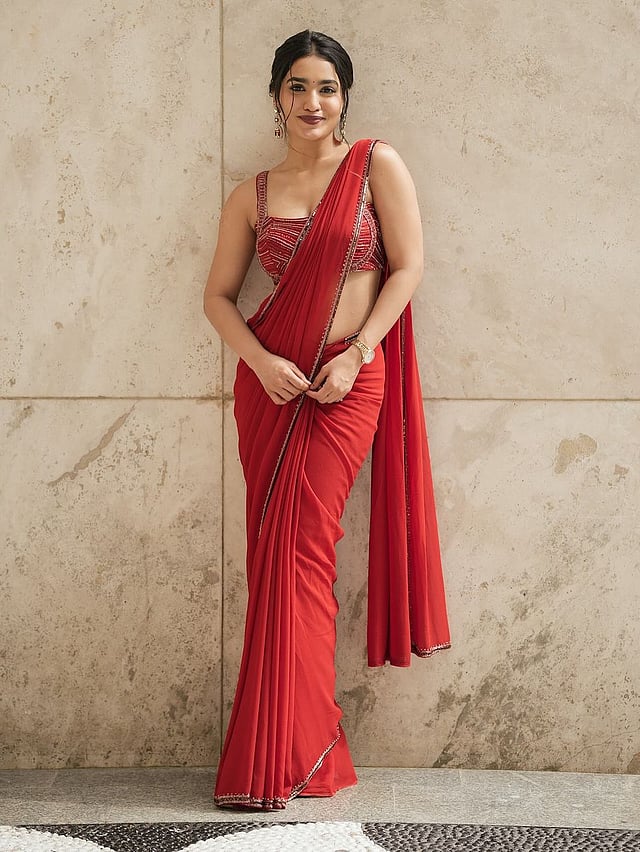 ചുവന്ന സാരിയിലാണ് സാനിയ സ്വര്ഗവാസല് ട്രെയിലര് ലോഞ്ചില് എത്തിയത്.