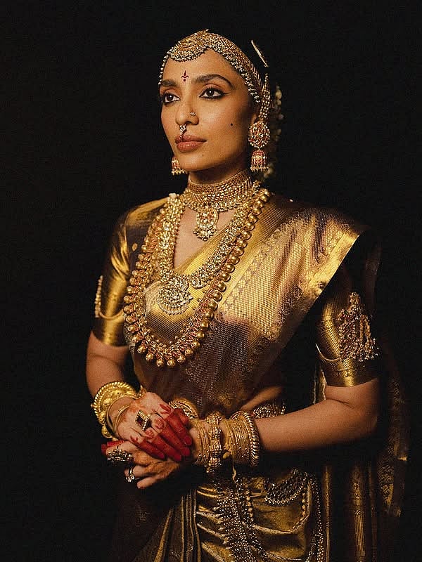 ഗോൾഡൻ നിറത്തിലെ കാഞ്ചീവരം സില്ക് സാരിയാണ് ശോഭിത വിവാഹത്തിന് ധരിച്ചിരുന്നത്.