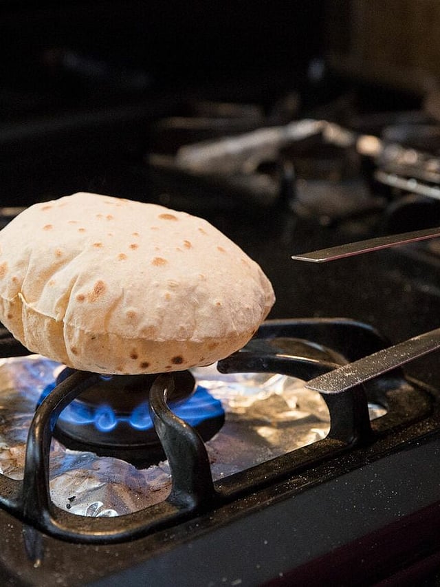ചപ്പാത്തിയുടെ ഒരു വശത്ത് നേരിയ കുമിളകൾ പ്രത്യക്ഷപ്പെടുമ്പോൾ, അത് മറിച്ചിടുക. മറുവശം നന്നായി വേവിക്കുക, തുടർന്ന് നേരിട്ടുള്ള തീയിൽ പൊന്തിവരാൻ അനുവദിക്കുക.
