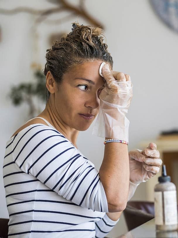 ഇളം ചൂടുവെള്ളത്തിൽ സോപ്പ് ലയിപ്പിച്ച് ഒരു കോട്ടൻ ബോൾ ഈ ലായനിയിൽ മുക്കി നിറം പിടിച്ചിരിക്കുന്ന ഭാഗത്ത് വൃത്താകൃതിയിൽ മസാജ് ചെയുക. പാടുകൾ നീങ്ങിയ ശേഷം ഈർപ്പം ഒപ്പിമാറ്റി മോയ്സ്ചറൈസർ പുരട്ടാൻ മറക്കേണ്ട.