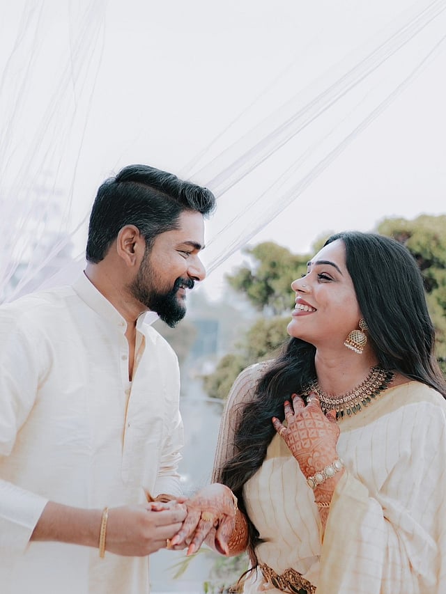 കസവു സാരിയിൽ അതിസുന്ദരിയായിരുന്നു സീമ. കസവ് കുർത്തയും മുണ്ടുമായിരുന്നു നിശാന്തിന്റെ വേഷം.
