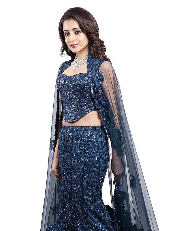 നീല നിറത്തിലെ ലെഹങ്ക ധരിച്ചാണ് തൃഷ ഓഡിയോ ലോഞ്ചിനെത്തിയത്.