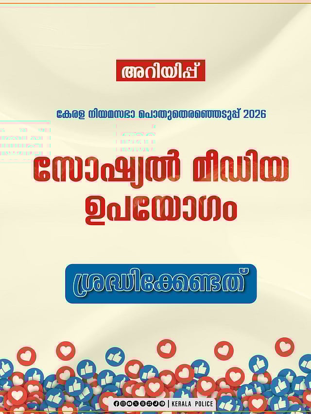 2026-ലെ കേരള നിയമസഭാ തെരഞ്ഞെടുപ്പുമായി ബന്ധപ്പെട്ട് മാതൃകാ പെരുമാറ്റച്ചട്ടം നിലവിൽ വന്നിരിക്കുന്ന സാഹചര്യത്തിൽ സോഷ്യൽ മീഡിയ ഉപയോഗിക്കുമ്പോൾ ജാഗ്രത പുലർത്തണം.
