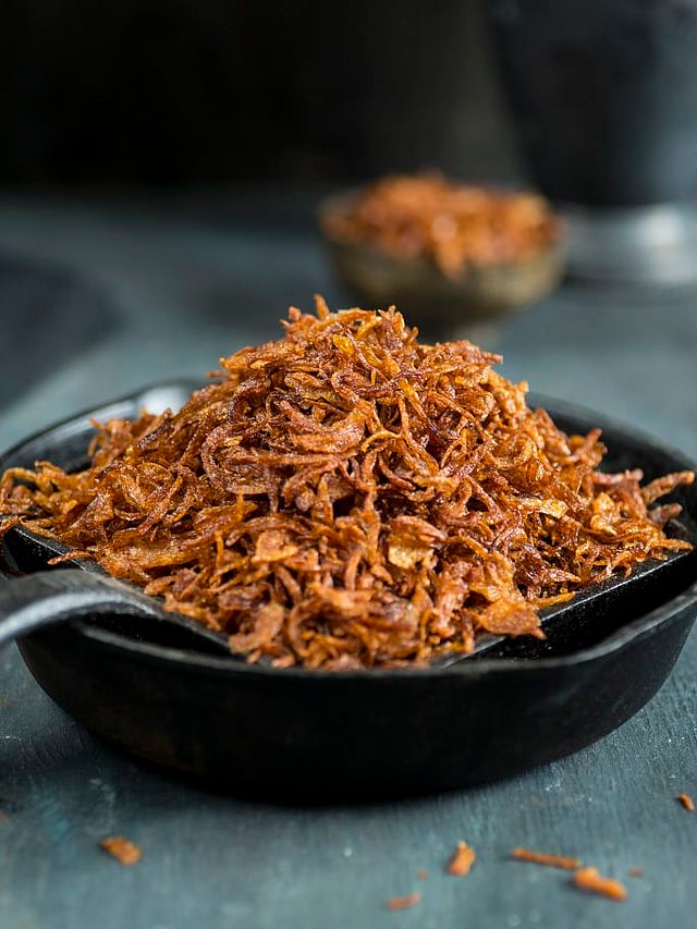 പല ഇന്ത്യന് കറികളിലും ഇങ്ങനെ പൊരിച്ചെടുത്ത ഉള്ളി ചേർക്കുന്നത് സാധാരണമാണ്.